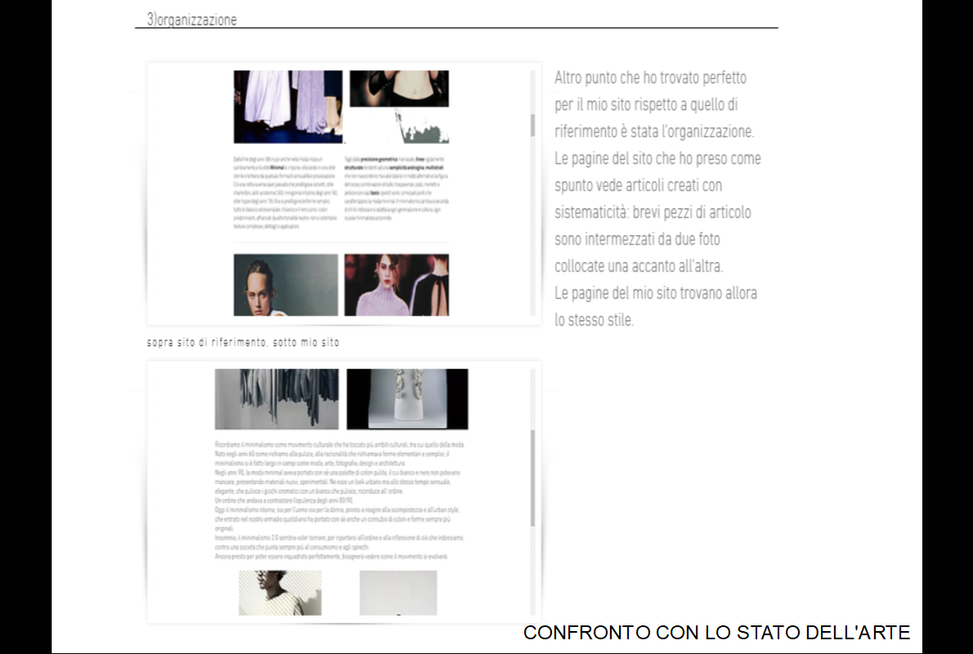 Presentazione utilizzata attraverso power point, per una miglior fruibilità dei contenuti riguardo "confronto con lo stato dell'arte" e "visibilità" si informa della loro disponibilità sul sito, sotto la sezione principale "minimalismo, moda e big data", si trovano le due pagine dedicate ad essi.